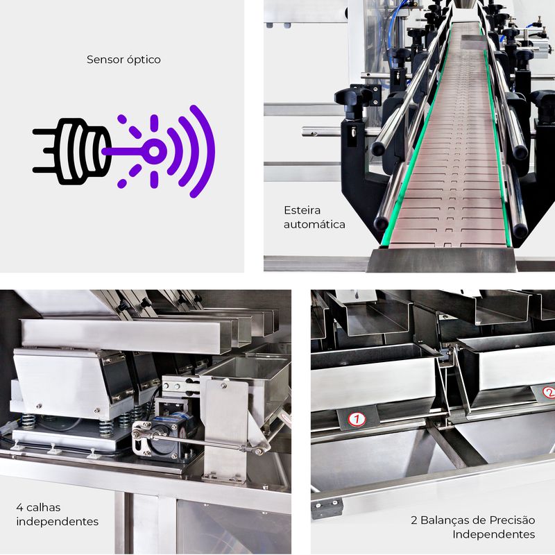 O modelo da Cetro conta com 4 calhas que ajudam a dosar o produto com mais eficiência, agilidade e precisão. Além disso, as calhas são responsáveis por despejar os produtos nas 2 balanças eletrônicas de alta capacidade, que dosam e despejam o produto na embalagem de forma independente, podendo ser acionadas separadas ou em conjunto, contribuindo para o aumento da produtividade durante a dosagem.