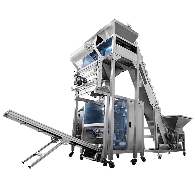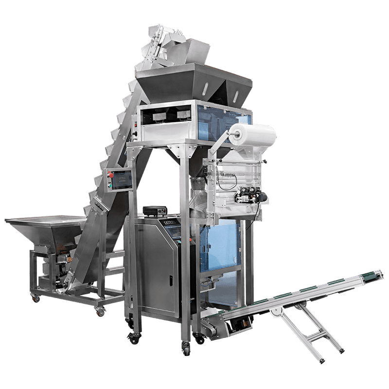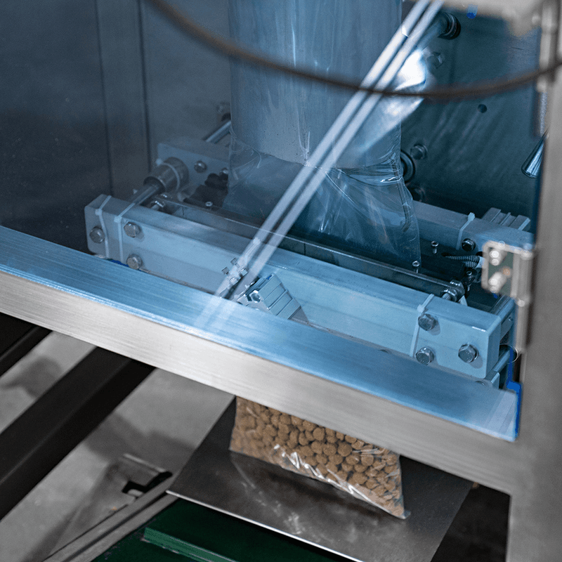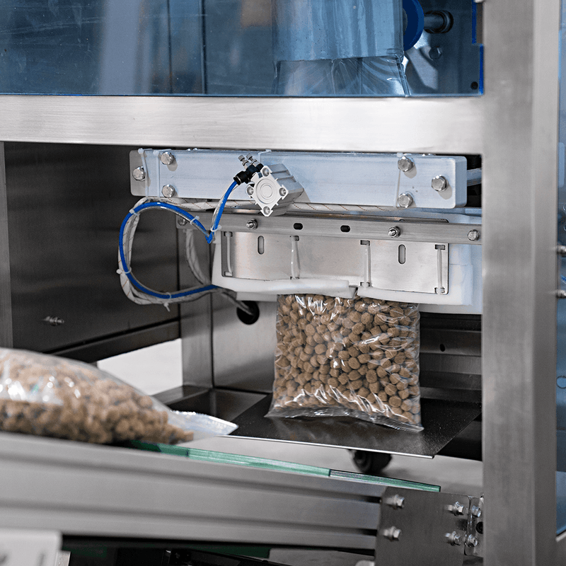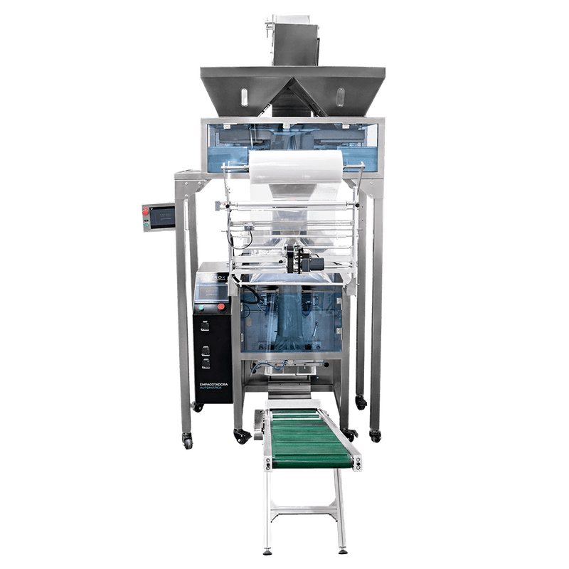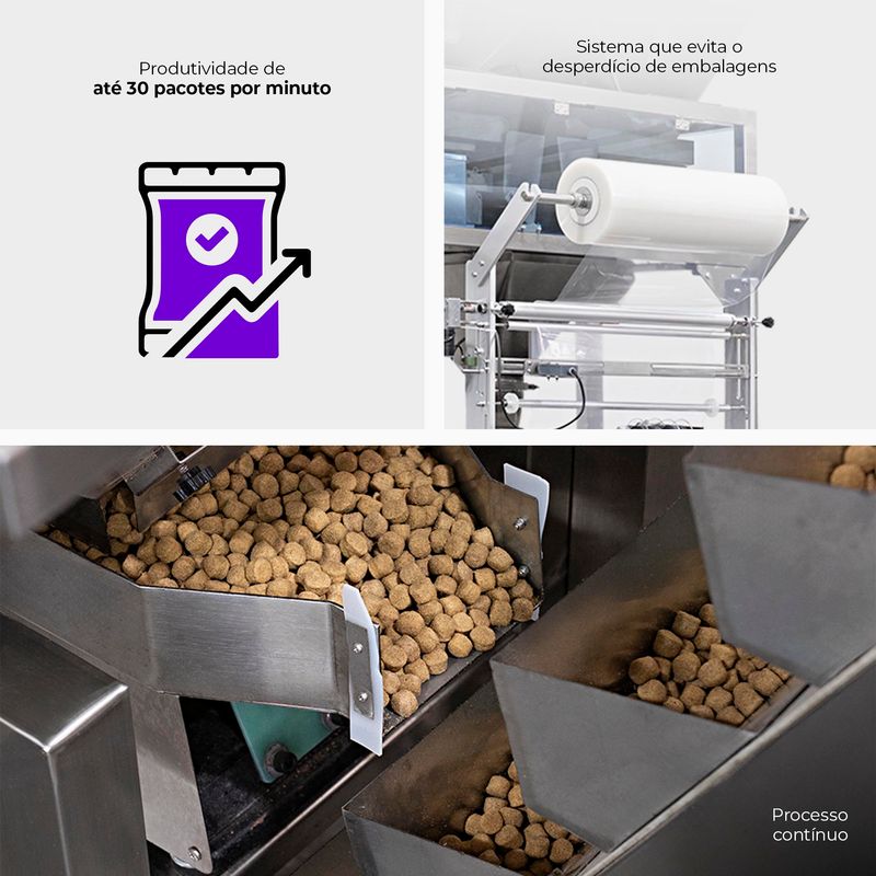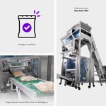 amendoim, castanhas, ração, trigo, açúcar, entre outros. O equipamento integra as etapas de dosagem, formação, selagem, abastecimento e coleta em uma única linha automatizada, garantindo a padronização das embalagens, a redução de perdas e maior eficiência produtiva ao longo de toda a operação.