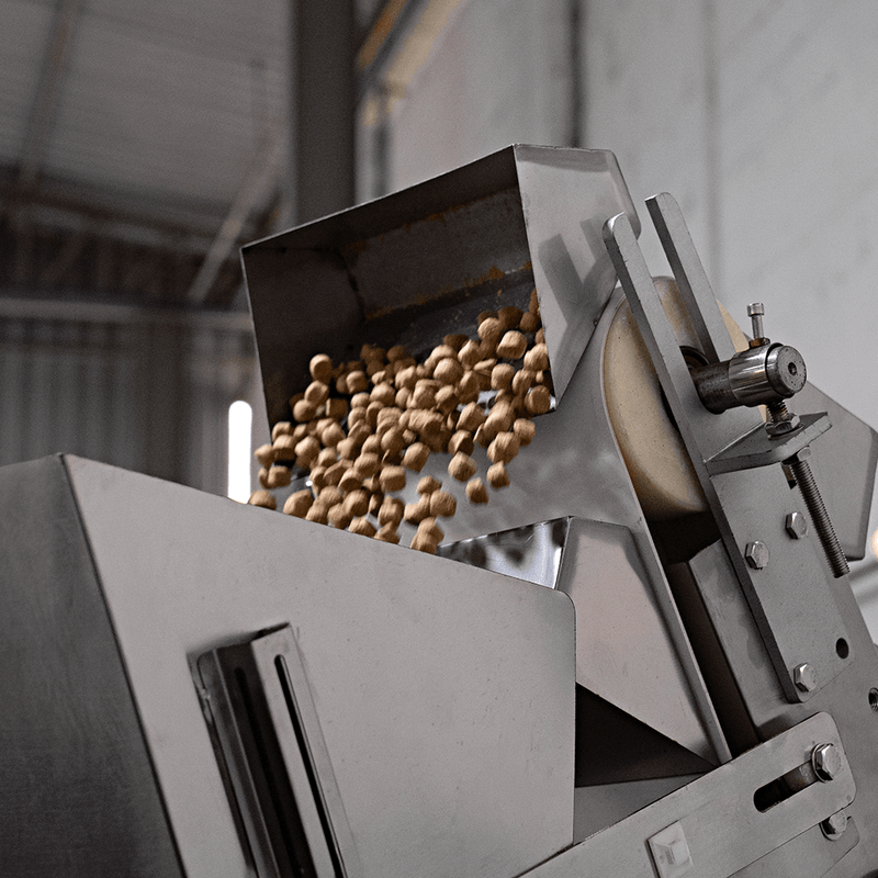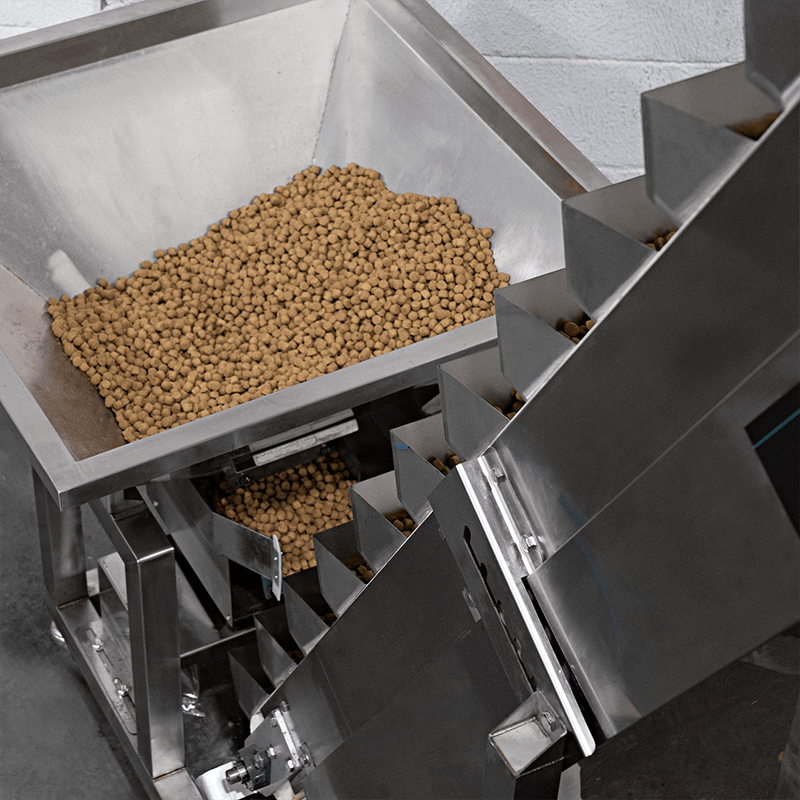 bicos e funis teflonados que reduzem a aderência do produto e células de carga de alta precisão, cada porção é dosada conforme os parâmetros configurados, mantendo a uniformidade e o controle do processo.