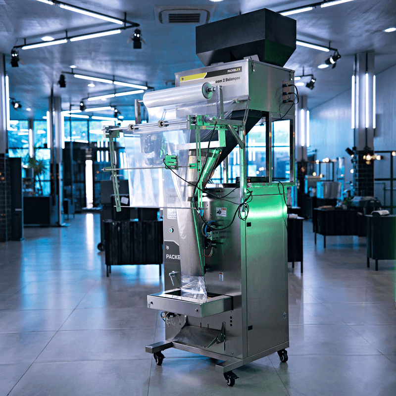 O produto colocado no funil superior da máquina é dosado por suas 2 balanças de acordo com as configurações previamente ajustadas em seu painel de controle IHM. Após a dosagem, cada balança da máquina despeja o produto no funil que o leva para as embalagens, onde são seladas e finalizadas. Todo esse processo é otimizado na medida em que uma das balanças despeja os produtos dosados e as outras dosam o restante do produto.