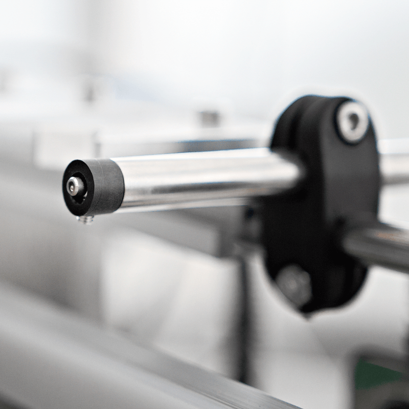 A esteira integrada à máquina possui regulagens de velocidade feitas por inversor de frequência que identifica quando o recipiente é colocado na esteira. Assim, essa máquina pode atender grandes linhas de produção e evitar o desperdício de produto.