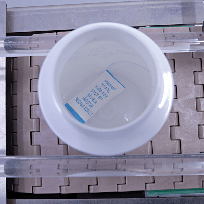 A Insersora Automática de Sílica Gel em Linha CAIM 60 SG insere sachês de sílica gel em frascos em um processo contínuo de forma precisa, rápida e totalmente automatizada.