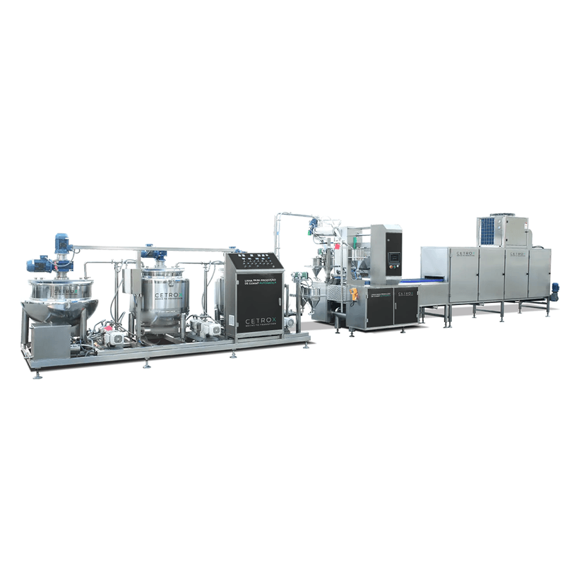 A linha é composta por reatores de processo e de dissolução de gelatina, responsáveis por preparar a base inicial e garantir a homogeneização dos ingredientes. No tanque de mistura são combinados elementos como açúcar, gelatina, glicose e água, formando a mistura principal da receita.