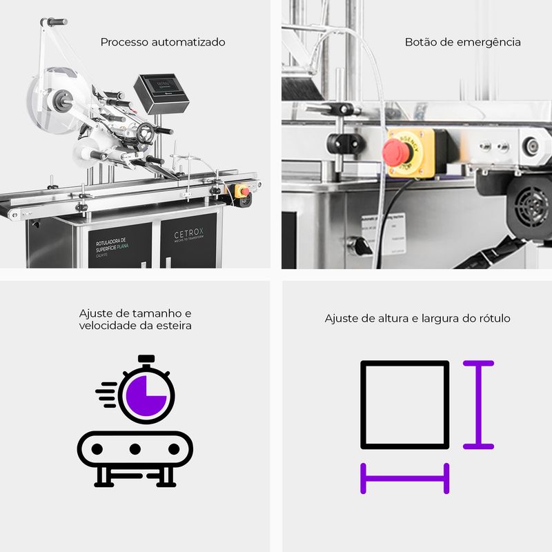 Além disso, a máquina Rotuladora da Cetro tem a capacidade de fazer o processo de automação da sua linha de produção possui capacidade de produção com o abastecimento de apenas um operador. Com ajustes de velocidade de produção, largura e altura do rótulo, a Rotuladora de Superfície Plana pode se adaptar à sua linha e embalagem com muita facilidade, bastando ela ser plana.